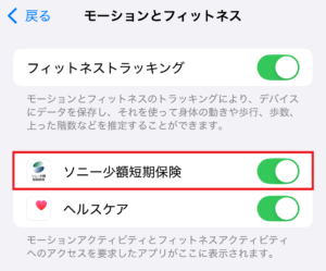 フィットネストラッキングをONにし、ソニー少額短期保険をONにします。