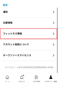 ソニー少額短期保険アプリを開き、右下のアカウント・設定>フィットネス情報 をタップするとモーションとフィットネスへのアクセス許可のメッセージが表示されます。