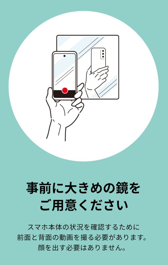 6.新しい端末情報の入力後、新しい機種に破損がないことを確認するため、鏡を使ってカメラでスマートフォンの前面・背面を5秒間ずつ撮影します。